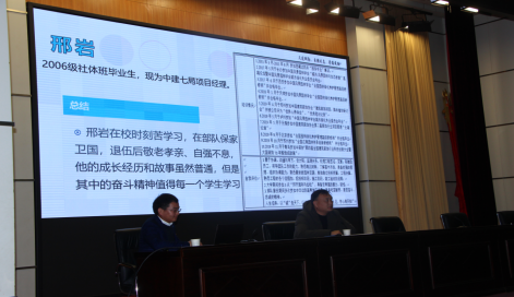 会议由杨强老师主持开始,接着邢岩学长主要从在校认真求学、在部队献身国防、在地方孝敬父母、在岗位精益求精这四个方面来进行分享交流,提醒大家一定要坚持不懈,永远不要丢掉学生的学习能力,并激励学弟学妹们积极学习,奋发向上。他发人深思的肺腑之言感染着现场的每一位观众,台下掌声不断,反响热烈。