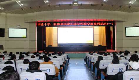 为进一步推进社会体育系发展,培养学生的学习能力,树立正确的人生观、价值观,我系于2019年12月17日13:50在学术报告厅举办了社体系成长经验交流活动,活动主要内容是我系2006级毕业生邢岩给大家分享毕业之后的十年奋斗历程及成长经验。出席本次活动的有社会体育系办公室主任杨强老师,辅导员党阳、王远方老师以及17级、18级全体学生。