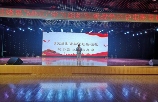 此次开班活动组织大家观看战争历史影片《八佰》,观影结束后,大家心情百感交集,王梦瑶同学上台发表观影感受:他们不是纯粹的“黑”,也不是纯粹的“白”,他们是等待被“唤醒”的一个个“灰色”的灵魂。他们的“黑”在于放弃抵抗,沉迷眼前的美好幻境,他们的“白”在于愿意为八佰壮士捐物资,在于企盼出现一个崭新的中国。最后参加“MMD”课程的全体人员大合唱《我和我的祖国》,用铿锵有力的歌声,表达出新青年的顽强意志。