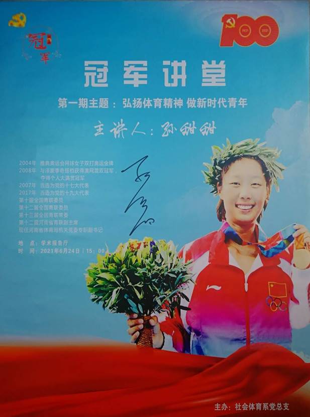 百年征程波澜壮阔,百年初心历久弥坚, 在“两个一百年”奋斗目标历史交汇的关键节点,为了深入贯彻全国教育大会精神,全力奋进教育强国、体育强国建设目标,按照学院党委党建工作部署,6月24日下午,由社会体育系党总支精心打造的郑州大学体育学院“弘扬中华体育精神 坚守立德树人初心”冠军讲堂第一期冠军讲座圆满开讲。
