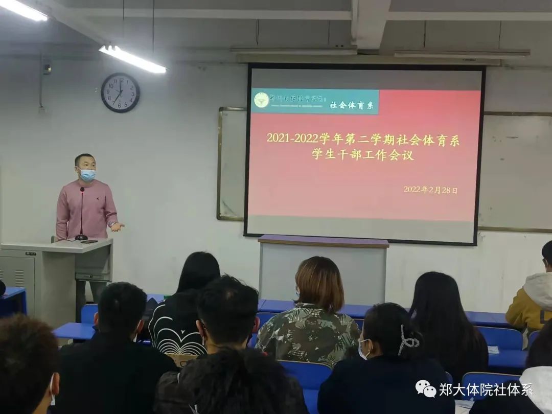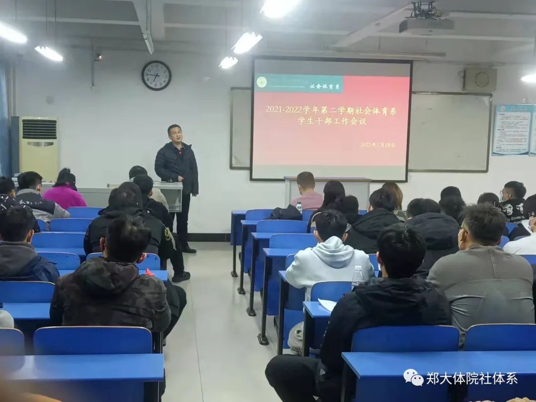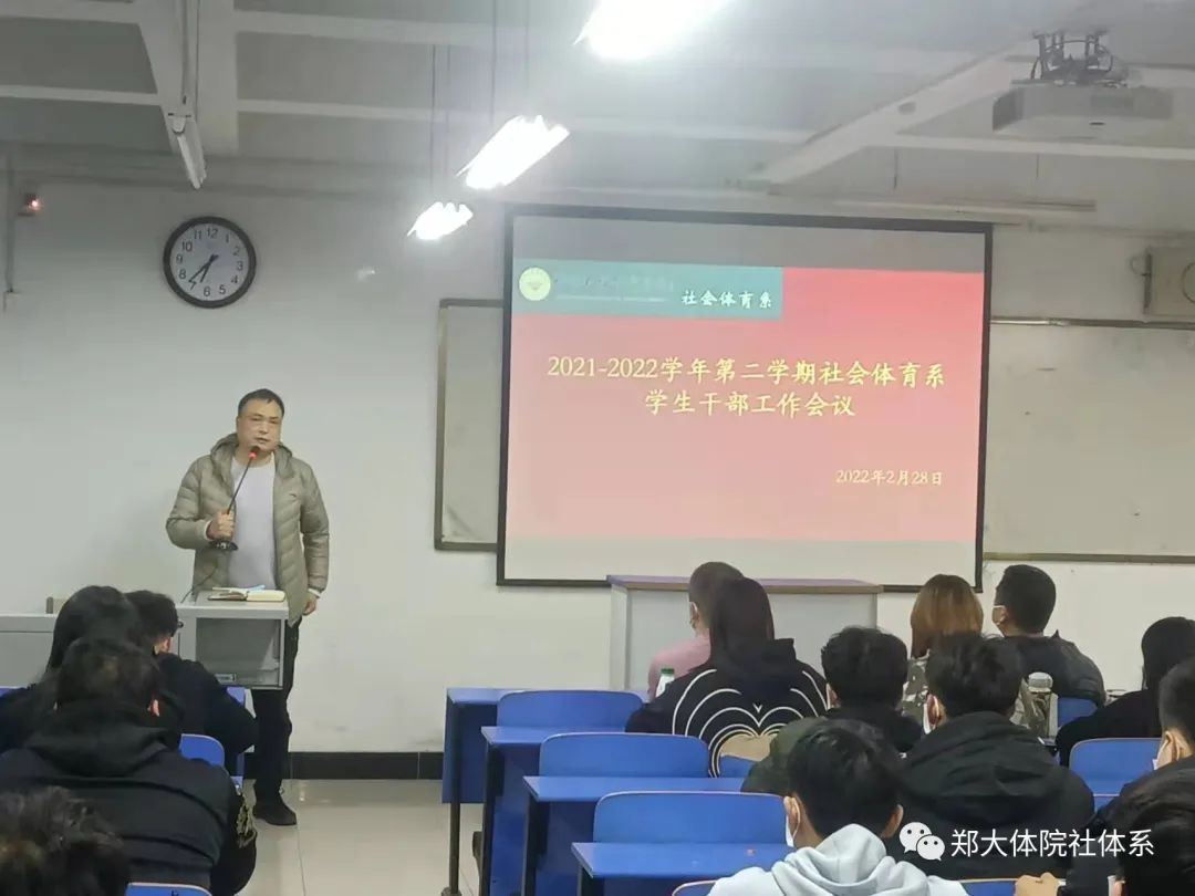 2022年2月28日,2021-2022学年第二学期社会体育系学生干部工作会议在教学楼406召开。社体系党总支负责人王豪杰、党总支副书记(副主任)杨强、团总支书记胡孝海、2019级辅导员尹悦、2020级辅导员党阳,以及2019级和2020级各班班干部参加了会议。