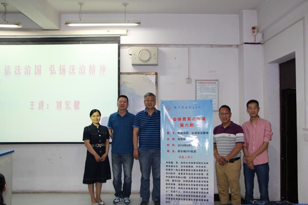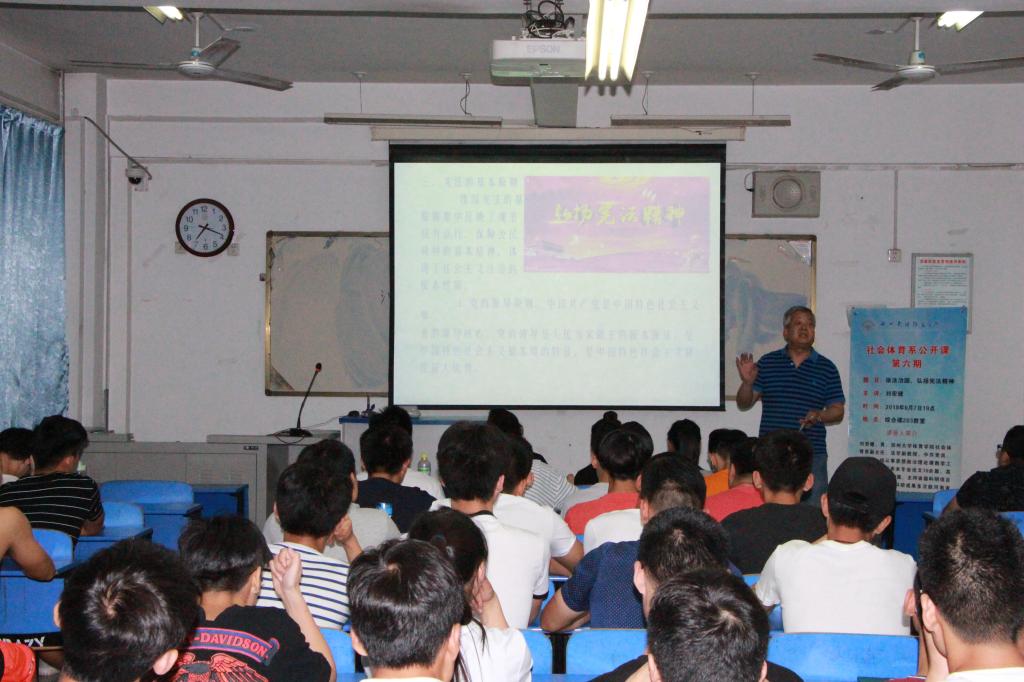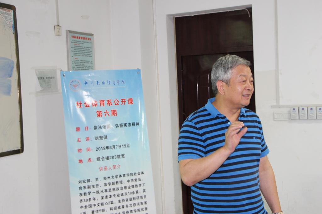 为深入开展宪法学习宣传教育活动,大力弘扬宪法精神,维护宪法权威,不断增强学生宪法意识,培育和践行社会主义核心价值观,引导学生做知法守法好公民,社会体育系第六期公开课以《依法治国,弘扬宪法精神》为主题,于6月7日晚七点在综合楼203教室进行,刘宏健副教授主讲。