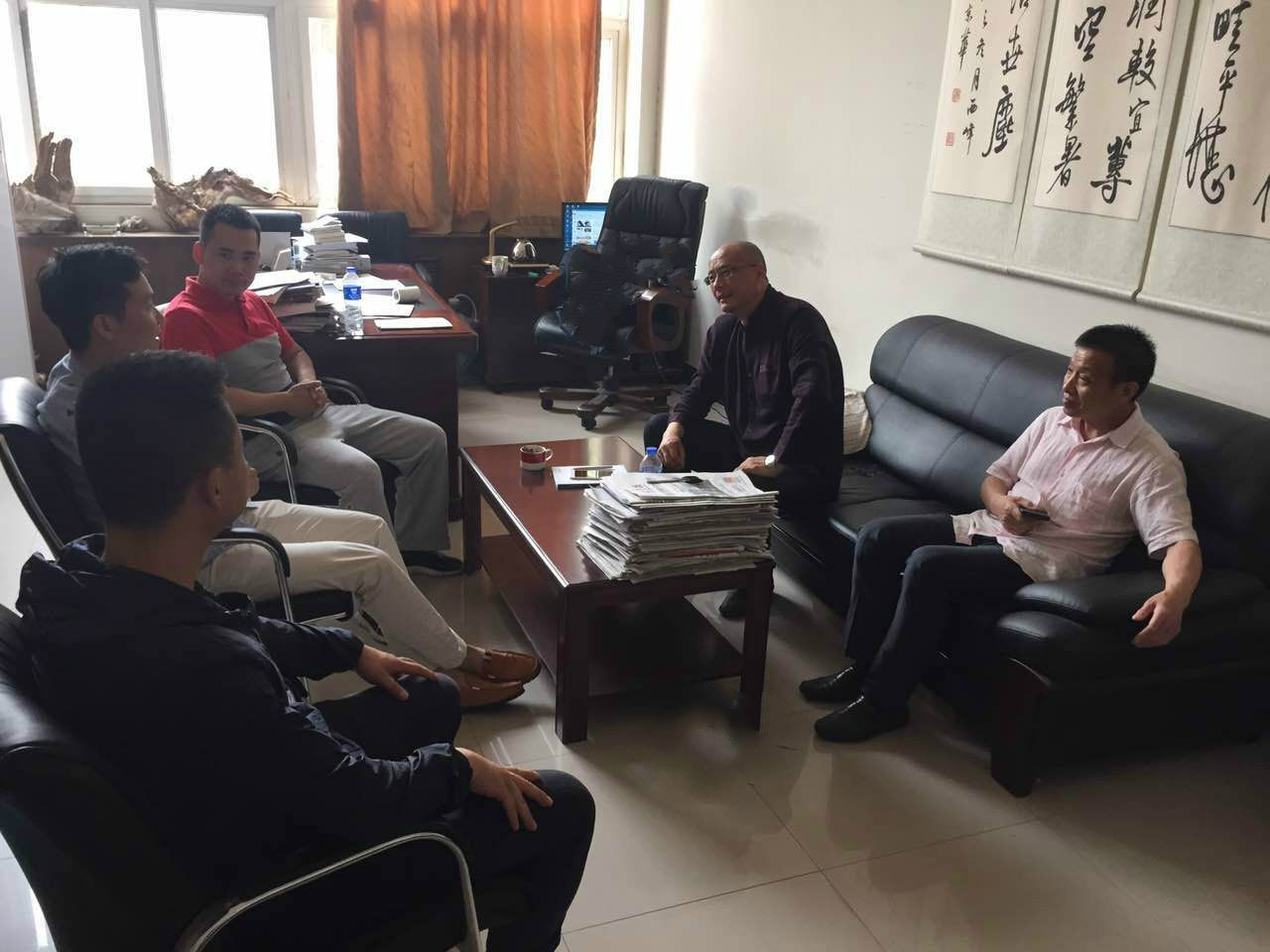 图一:系领导同用人单位座谈(座椅上依次为郑州动乐美健身健身服务有限公司法人代表李红杰、许昌东区金石铂爵健身俱乐部经理刘永健、法人代表郑英利、沙发上依次为系主任王东亚、系总支书记周明银)