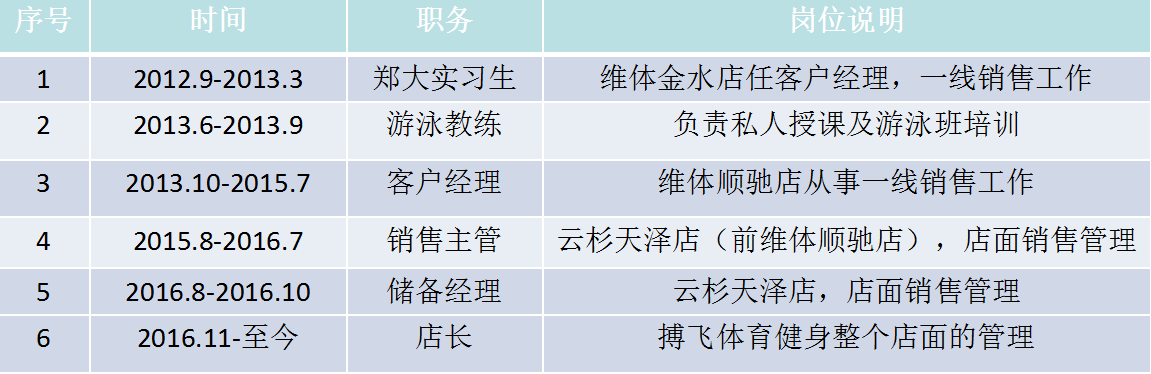 我叫杨定豪,大家更喜欢叫我杨光。2009年我考到了郑大体院,像所有的大学生一样,对大学生活满是憧憬和幻想,除了三点一线的学习生活,我也热衷于丰富的课余生活,摆小摊儿、做兼职教练、穷游……,这些看似不起眼的经历,在后来的工作中也对我有很多影响。2012年9月跟随学校的安排,我在维体健身金水店开始了人生中第一份正式的工作,也是对我影响最深远的一份工作。戏剧化的是,我实习的第一课就是被淘汰,因为身高不够公司教练的标准,我与自己最喜欢教练工作无缘,领导告诉我只能做销售的工作,那时的年轻气盛和一点点的小小自尊,让我倔强的坚持自己的意愿——我只想做教练。后来公司面试我的一个领导告诉我,做销售更锻炼人更能学到东西,“销售是所有成功人士的基本功”,于是我就阴差阳错的做了健身房会籍顾问,这一做就是几年,由一开始的反感到适应再到得心应手,渐渐的我也喜欢上这份职业。从2012年9月开始到2013年元旦实习结束,我都在维体健身金水店做一线销售,发单页、培训、接待客户等等。日复一日,在繁琐枯燥而压力又很大的工作中,我得到了从未有过的历练。随着实习的结束,很多和我一起来的同学都选择了离开,只有我和为数不多的几个人留了下来。也是因为当初的坚持,我对自己有了更深刻的认识,我清楚的知道自己的目标和和想要的未来,我下定决心要在这闯出一片天。