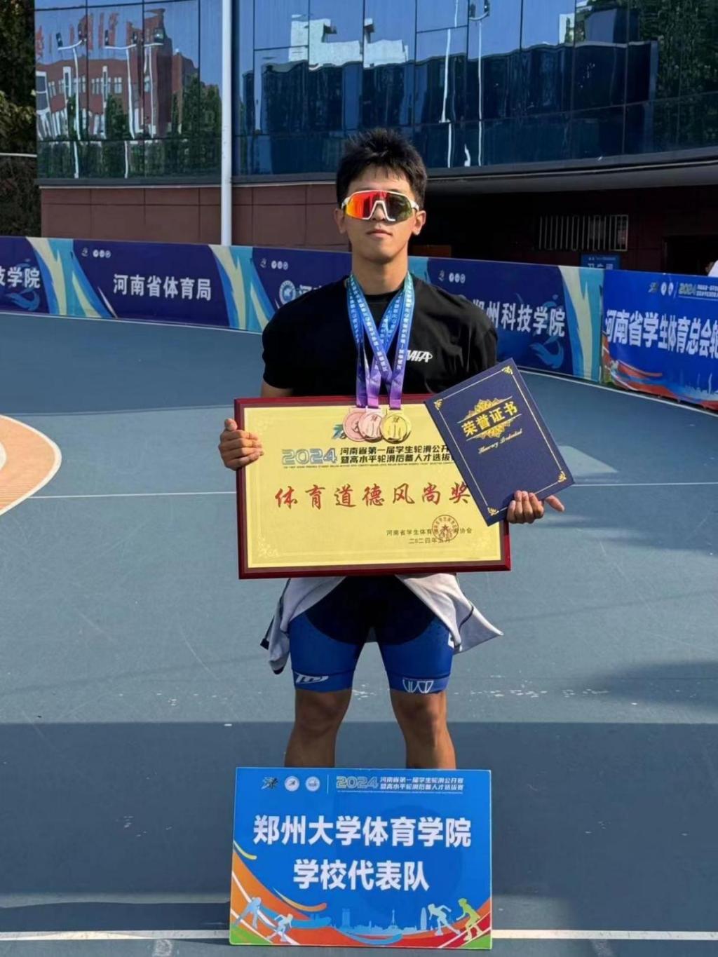 本次比赛中,我系学生周亦飞凭借扎实的技术和出色的竞技状态,力压群雄,勇夺速度轮滑500米计时赛冠军。此外,在300米和1000米计时赛中,周亦飞同学同样展现出了不俗的实力,赢得了两枚季军奖牌。同时,周亦飞同学还荣获了“高水平轮滑后备人才”(种子选手)荣誉称号。
