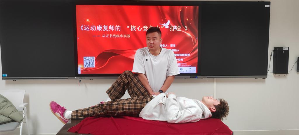 本次讲座面向2024级6班、7班(运动康复方向)班同学,先后开展《运动康复师的多元赛道》《运动康复师的“核心竞争力”打造》两场讲座。蔡龙从参会汇报论文《肌筋膜触发点冲击波疗法联合PNF治疗腘绳肌拉伤研究》《基于肌筋膜触发点思路的疾病与治疗的文献计量学分析》导入,分别就学业和职业规划、运动康复前沿技术两大专题进行授课,并在现场演示手法解决腰部后仰痛、膝关节半月板外侧疼痛的案例。由于解决疼痛效果立竿见影,激发了同学们的学习热情,纷纷近距离观摩操作手法,现场互动气氛热烈。