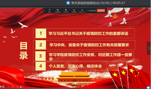 会议开始,首先是组织大家观看了《习近平总书记在统筹推进新冠肺炎疫情防控和经济发展工作部署会议》及《布衣院士:卢永根》等视频。接着是集中理论学习,李杰书记带领大家学习习近平总书记关于疫情防控工作的重要讲话精神,学习中央、省委关于疫情防控工作有关部署要求及学院疫情防控工作安排,结合实际对大家近期工作提出一些要求,要求大家要切实把思想和行动统一到党中央决策部署和省委要求上来,自觉落实到学院疫情防控工作具体行动中。最后是支部所有党员围绕此次活动主题进行个人发言,交流心得、畅谈体会。