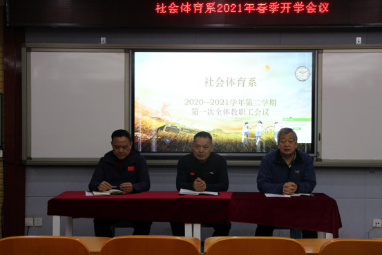 盛世又逢新岁月,春来更有好花枝。2月24日上午,社会体育系2021年春季学期首次全体教职工大会在教学楼304室召开,系党政领导班子成员及全体教职工参加会议。社会体育系副主任刘宏健主持会议。