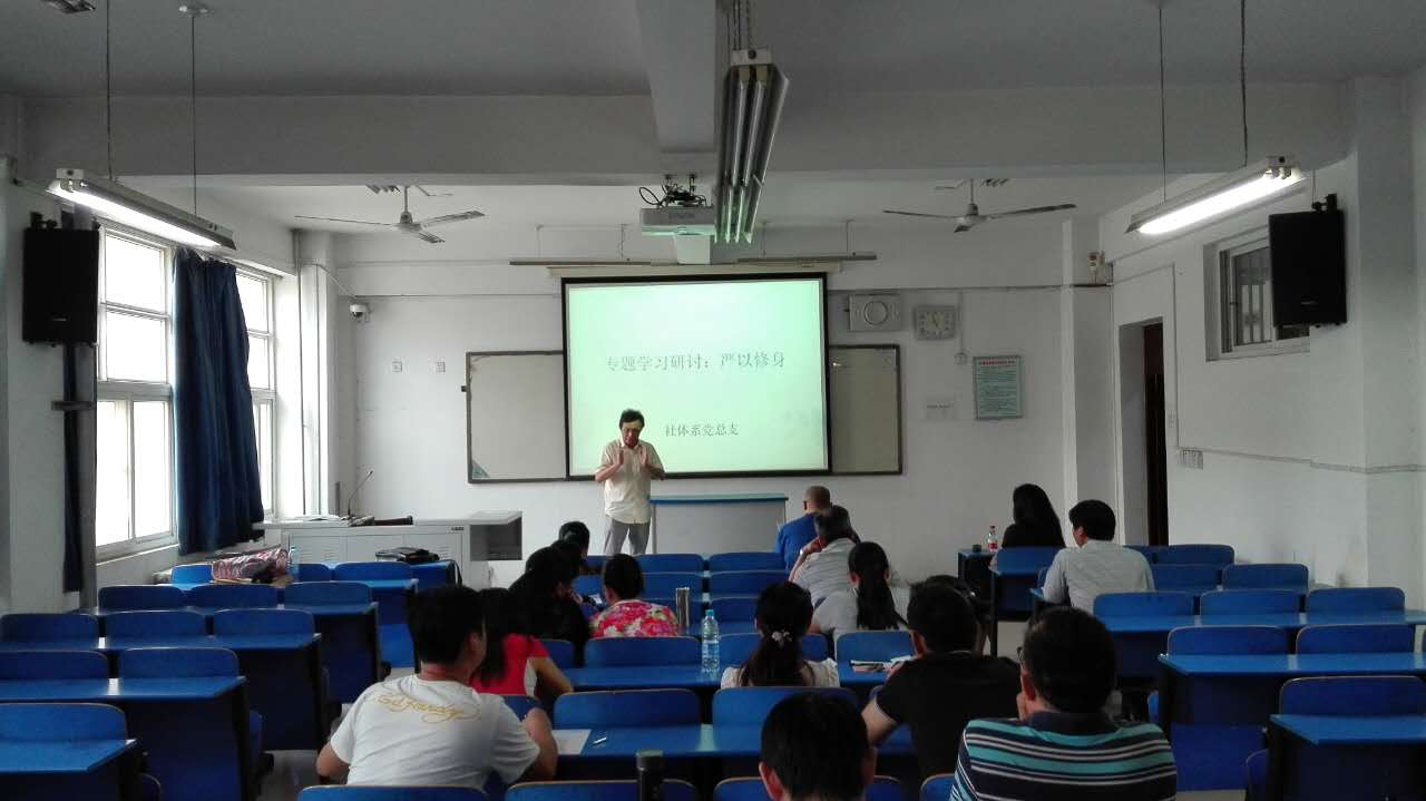 2015年7月9日下午17点,社体系教师支部在综合楼203举行总支书记讲党课活动暨“三严三实”教育专题一党课辅导,由系党总支书记周明银同志主讲。专题一的主题是“严以修身”,周明银同志围绕这个主题,引用古今中外圣贤与革命家的修身方法与名言警句,阐释了新时代条件下共产党人应如何学习先进人物的修身经验,牢记反面典型的教训,对党员同志进行了一次深刻的党课教育。