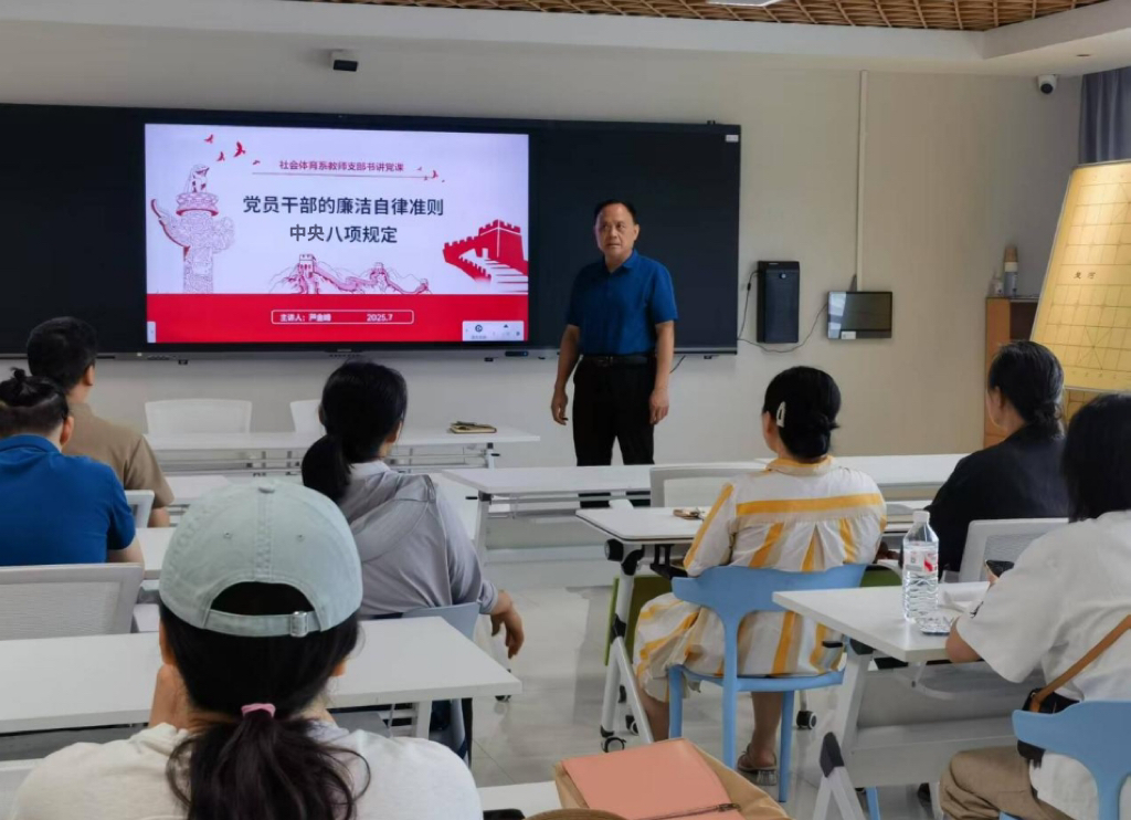 2025年7月1日,社会体育系教师党支部书记芦金峰同志以《党员干部的廉洁自律准则——中央八项规定》为题,为本支部党员及入党积极分子讲授了一堂主题鲜明、内容深刻的专题党课。