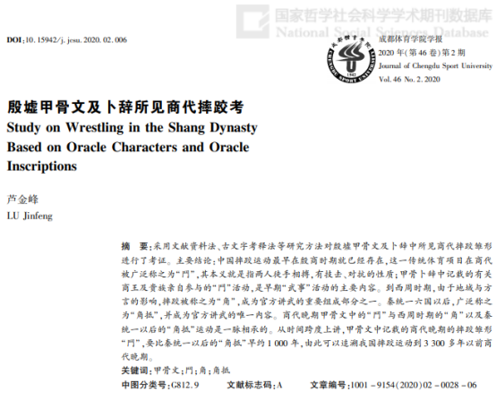 芦金峰教授主持的2019年度国家社科基金项目“殷墟甲骨文体育刻辞整理与研究”阶段性研究成果《殷墟甲骨文及卜辞所见商代摔跤考》于2020年第2期见刊于《成都体育学院学报》后,又被《人大复印报刊资料˙体育》2020年第8期全文转载。该研究通过考释殷墟甲骨文及卜辞等文献,认为后世所说的“角”或“角抵”等,实际上与殷商时期的“鬥”一脉相承,由此把中国摔跤运动的上限追溯到3300多年前的殷商时期,改写了中国摔跤运动史。