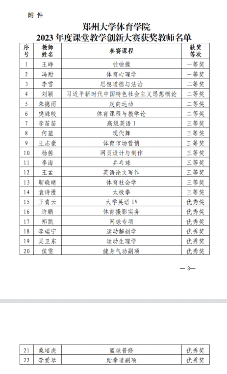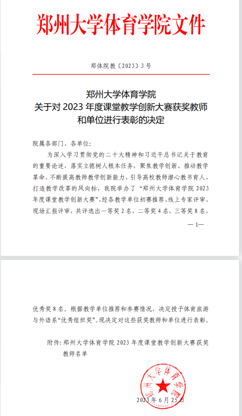 为深入学习贯彻党的二十大精神和习近平总书记关于教育 的重要论述,落实立德树人根本任务,聚焦教学创新、推动教学 革命,不断提高教师教学创新能力,引导高校教师潜心教书育人, 打造教学改革的风向标。6月20日,我院举办了 “郑州大学体育学院2023年度课堂教学创新大赛”决赛,决赛在图文信息楼七楼715举行,我系樊姝皎、靳晓晴两位老师代表系部参加了此次比赛的线上评审,并顺利进入校级决赛。