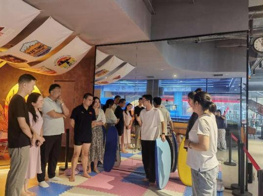 活动分为三个环节:参观新兴体育商业综合体;室内滑板冲浪项目体验;教师座谈——体育产业融合交流。北龙湖金融岛作为郑州东区的地标之一,其地理位置的优越性为新兴体育项目的发展提供了土壤。通过参观冲浪、皮划艇等水上项目实体基地,教师们开阔了眼界,提升了对新兴体育项目的认知。此外,教师们认真学习室内滑板冲浪项目的规则及动作要领并亲身体验实践,为今后的教学积累实践经验。最后,教师们针对体育产业的发展各自发表了观点。书记王豪杰对社体系的发展提出了新的要求,希望教师们重视基层教学组织的建设并努力打造成优秀的基层教学组织。